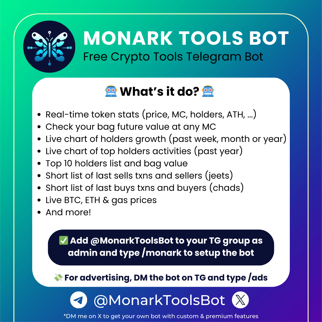 I'm proud to announce that Monark Tools Bot is now up and running on Telegram! You can now add it for free in your group and start using the tools! Keep in mind that the bot only works with ETH, BASE & SOLANA tokens for now, more chains coming soon.
